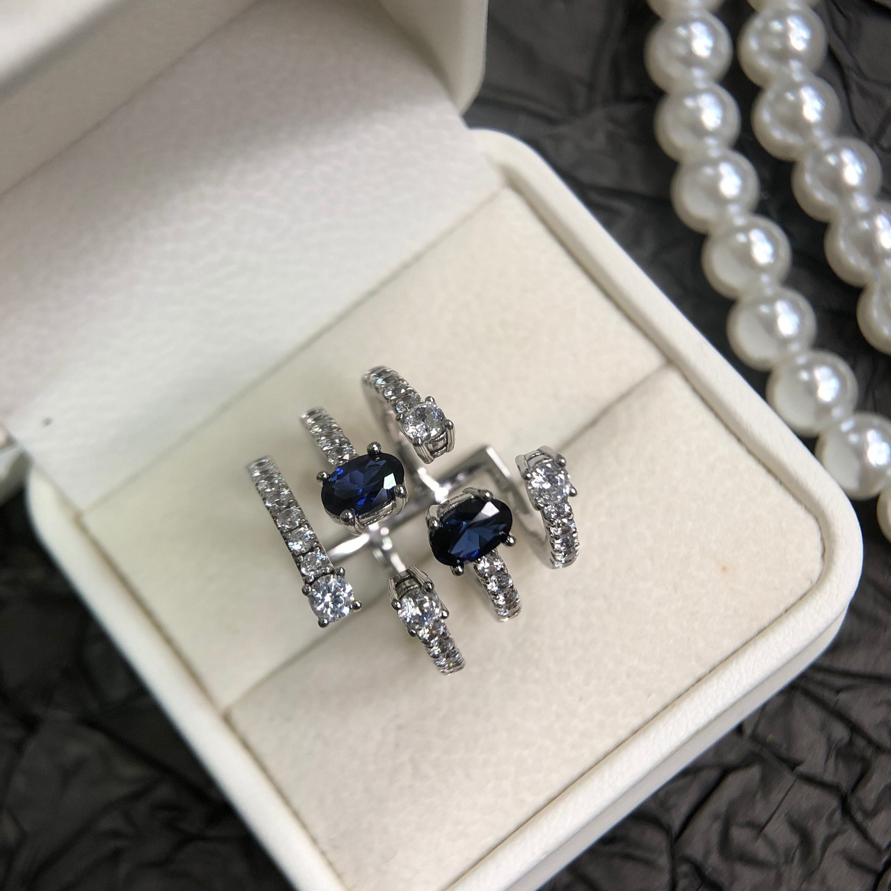 ・深みのある青色のジルコニアを層状に重ねたデザインで、個性的な魅力を放ちます。